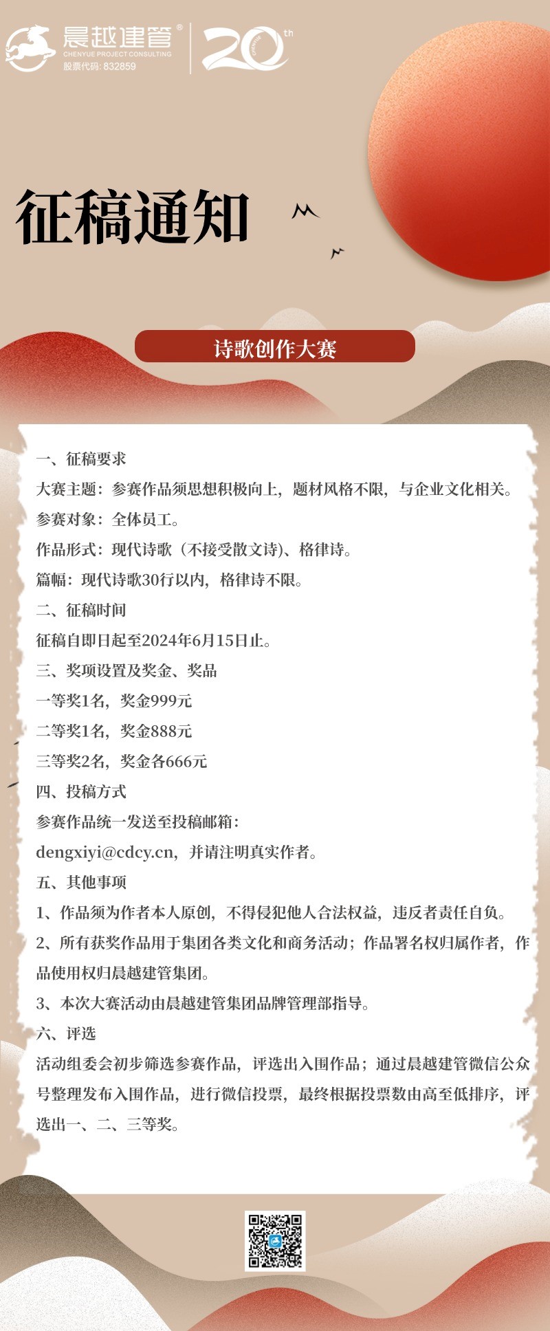 2024年是晨越建管集团成立二十周年之际,为宣传、弘扬晨越文化,以诗歌形式呈现晨越人文之美、精神之美,现举办诗歌创作大赛。