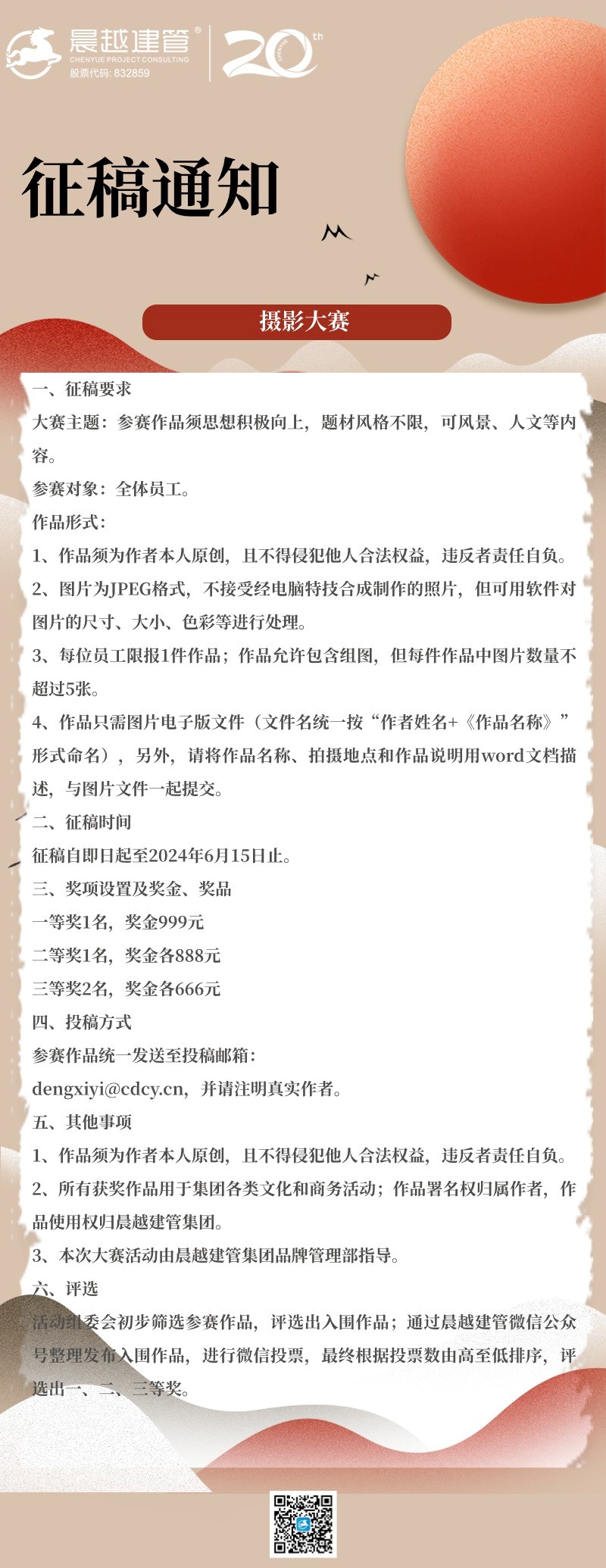 2024年是晨越建管集团成立二十周年之际,为宣传、弘扬晨越文化,以摄影形式展现晨越人生活、工作中的美好时刻,现举办摄影大赛。